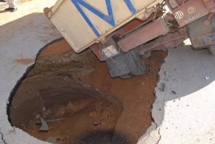فيديو| حفرة تظهر على الطريق فجأة وتبتلع شاحنة!