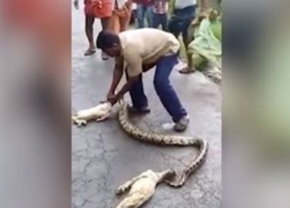 فيديو| رجل يخرج زوج من الماعز من بطن ثعبان حي!