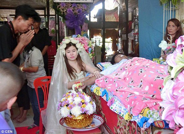 تزوجت امرأة تايلاندية الرجل الذي كانت تحب بعد وفاته بذبحة قلبية، وفق ما نقل موقع ديلي ميل.