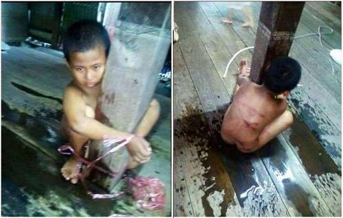 صورة لصبي يبلغ من العمر سبع سنوات مقيد بعمود خشبي وتبدو عليه اثار التعذيب