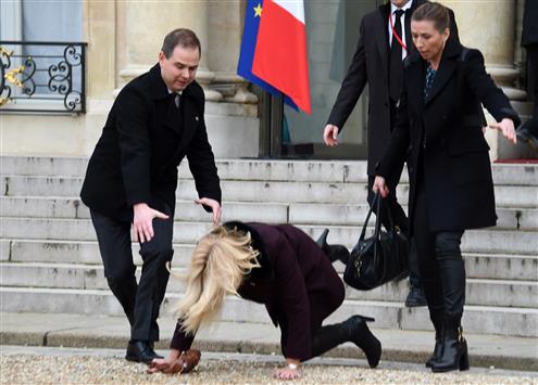 نشرت وكالات الانباء ومواقع التواصل صورا بسقوط رئيسة وزراء الدانيمارمك هيلي شميث امامم قصر الايزيه في باريس . وكانت شميث
