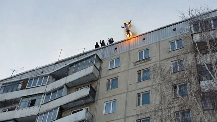 أشعل شاب روسي روسي مغامر النار بجسده ثم القى نفسه من اعلى مبنى يتكون من 9 ادوار ، بوجود عدد من المصورين والصحفييمن و أمام الكاميرات،