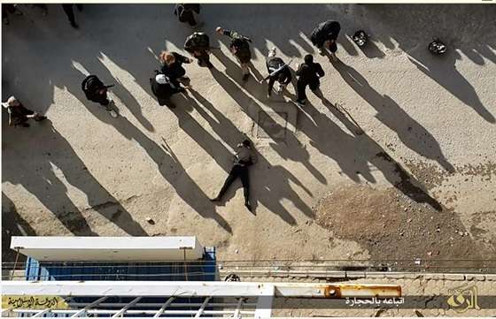 وظهر في الصور تجمهر عدد كبير من سكان المدينة السورية، حيث ألقى عناصر التنظيم الشاب من فوق بناية عالية، ثم انهالوا عليه بالحجارة إمعانًا في تعذيبه.