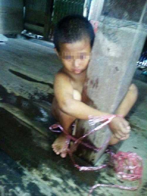 صورة لصبي يبلغ من العمر سبع سنوات مقيد بعمود خشبي وتبدو عليه اثار التعذيب والمعاملة القاسية ..