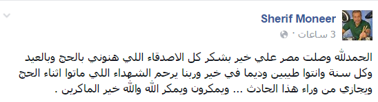 وقال شريف منير، في منشوراته : ( الحمد لله وصلت مصر على خير بشكر كل الأصدقاء اللي هنوني بالحج وبالعيد وكل سنة وأنتوا طيبين ودايما في خير وربنا يرحم الشهداء الذين توفوا أثناء حادث التدافع في الجنة بإذن الله ).