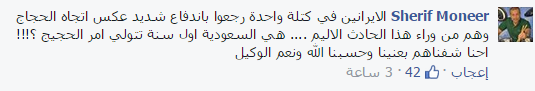 وأضاف: ( الإيرانيين في كتلة واحدة رجعوا باندفاع شديد عكس اتجاه الحجاج وهم من وراء هذا الحادث الأليم هي السعودية أول سنة تتولى أمر الحجيج؟ إحنا شفناهم بعيننا وحسبنا الله ونعم الوكيل ).
