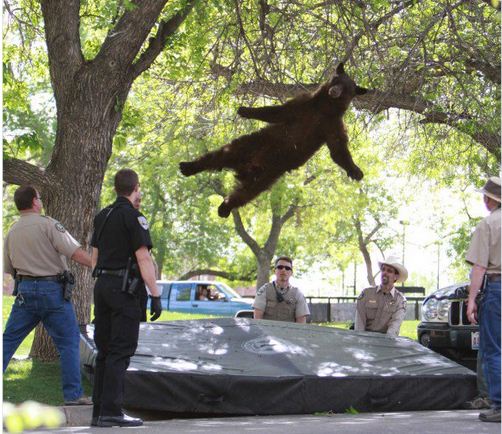 استدعيت الشرطة في ولاية كولورادو الأميركية لمساعدة عائلة اتصلت طالبة النجدة بعدما وجدت دباً تسلل إلى حديقة منزلهم وتسلق شجرة داخلها لينام على أحد جذوعها، وعندما حضرت الشرطة قامت بتخدير الدب عبر رمي سهم يحمل مادة مخدرة، واستعدت لسقوطه، ملتقطة هذه الصورة المرحة.