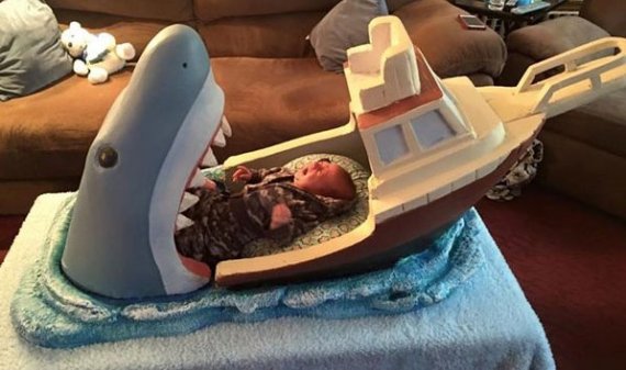 أهدى شخص يدعى جوزيف رينيلا ابن شقيقه الرضيع مهداً يحاكي مشهداً من فيلم Jaws (الفك المفترس)، أحلاماً سعيدة!