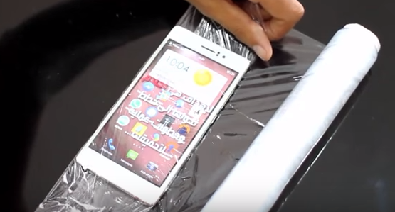 1- من خلال استخدامك لورق البلاستيك، المستخدم في المطبخ، قم بتغليف الهاتف به جيدا، وتأكد أنك قمت بتفريغ الهواء من داخل البلاستيك، حتى لا يكون هناك منفذ لدخول الماء.