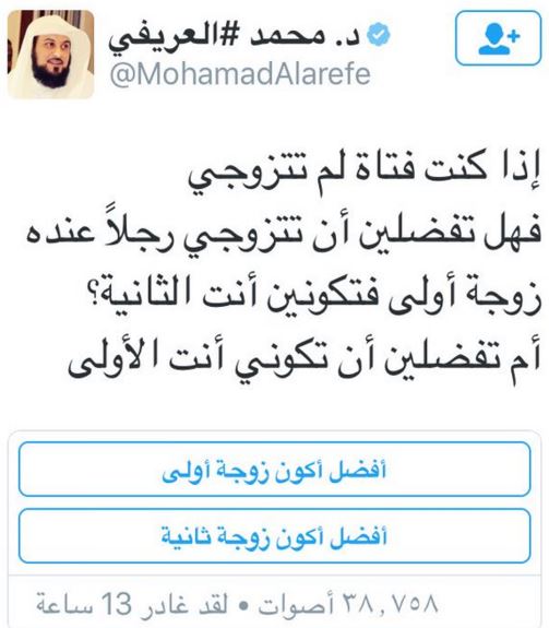 وقال العريفي، فى تغريدة عبر حسابه على “تويتر” : ”إذا كنت فتاة لم تتزوجي فهل تفضلين أن تتزوجي رجلاً عنده زوجة أولى فتكونين أنت الثانية؟ أم تفضلين أن تكوني أنت الأولى”.